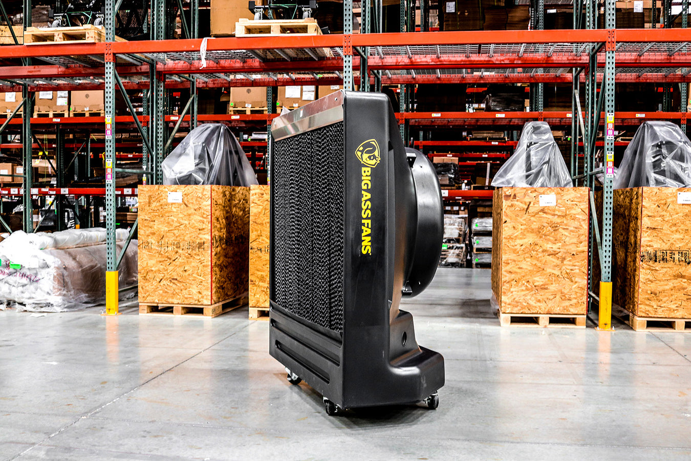 Presentamos el modelo Cool‑Space® de Big Ass Fans: enfriamiento evaporativo de alta capacidad, diseñado para espacios amplios, interiores o exteriores, con manguera estándar, ruedas de transporte y control de velocidad variable.
